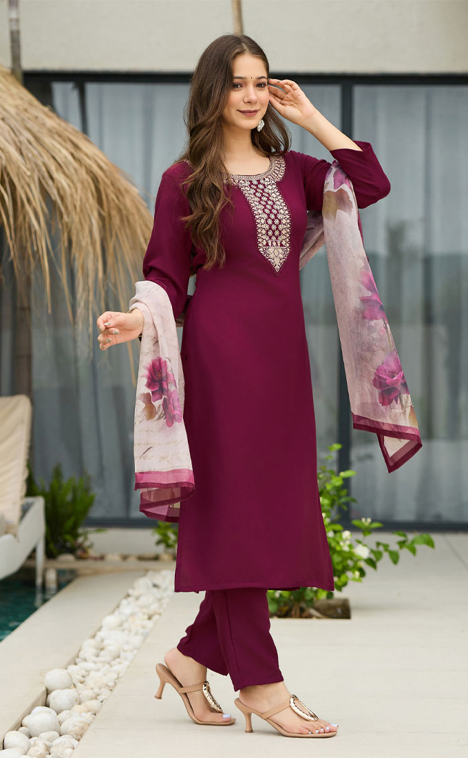 Women’s Orange Rayon Embroidered Straight Kurta with Rayon Pant And Taby Printed Dupatta Sets